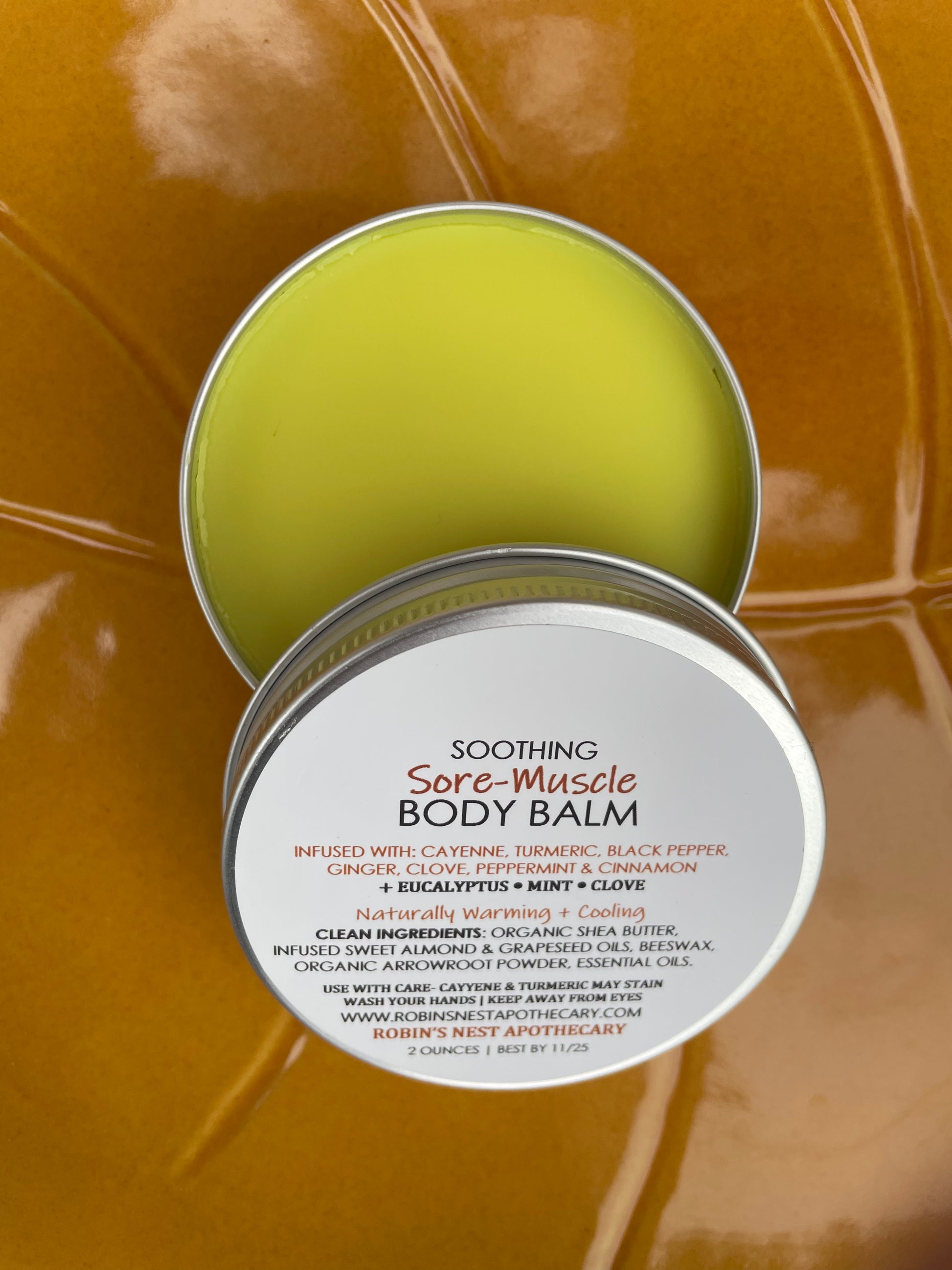Cayenne/Turmeric may stain clothes/linens (I recommend having "sore muscle" Clothes/Linens that you wear when you use this balm).